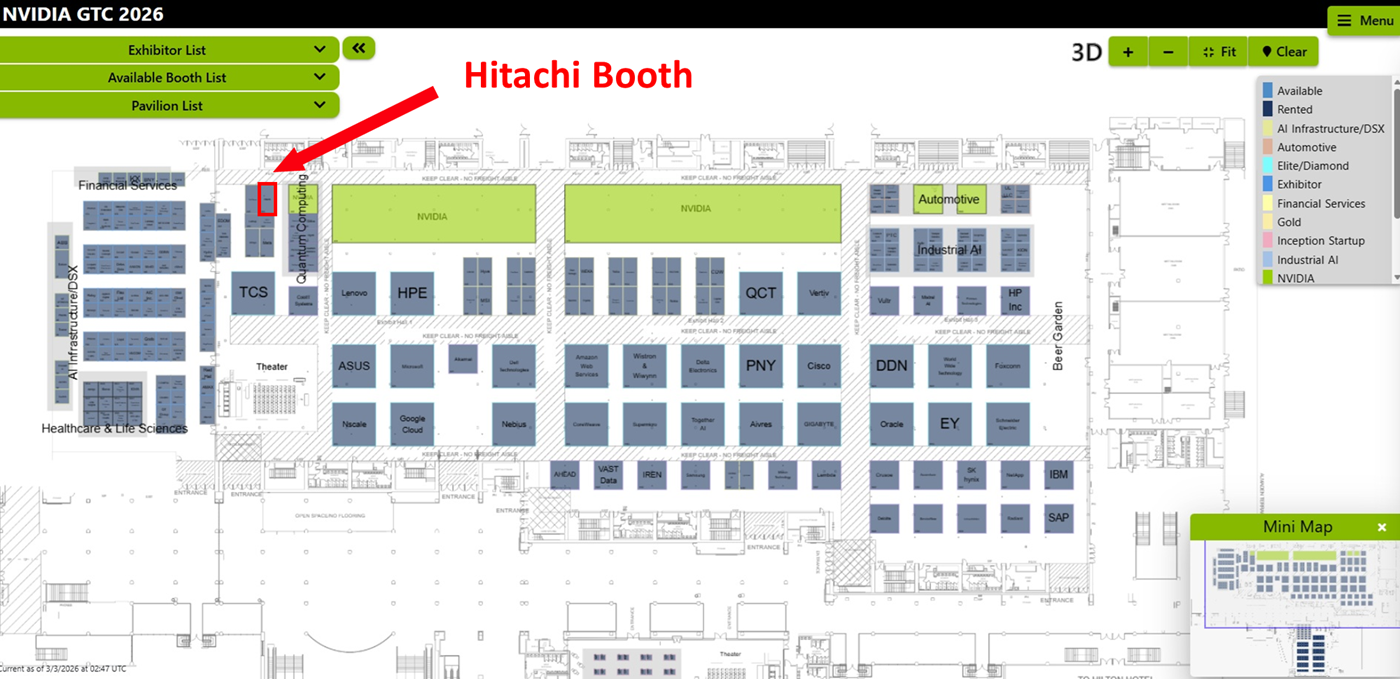 At Hitachi's booth, Hitachi will showcase a full range of infrastructure, GPU hardware, Hitachi and NVIDIA software, and Physical AI solutions, including: